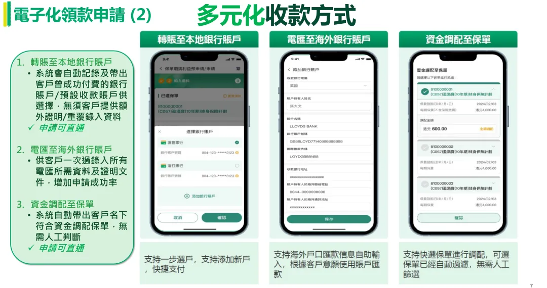 更贴心的是,收款方式多元化,三种不同的收款方式任选:转账到本地银行账户、电汇至海外银行账户,或资金调配到保单,收款方式灵活便捷。