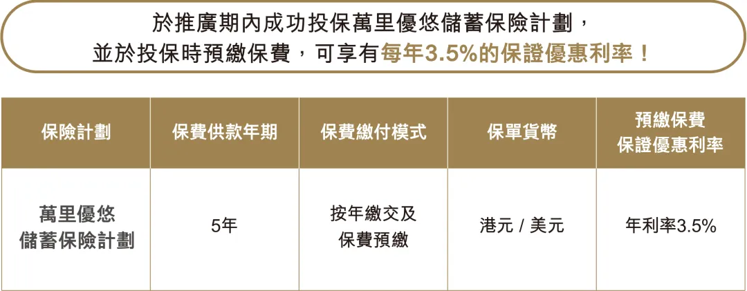「万L优悠」预缴保费,享受3.5%保证优惠利率,投保时直接少交,相当于直接减免年缴保费的33%。