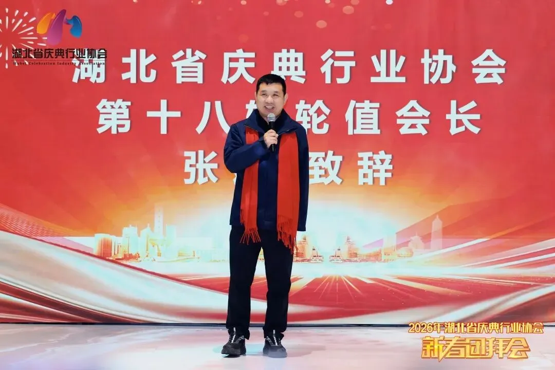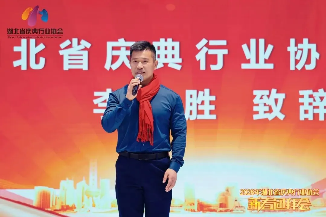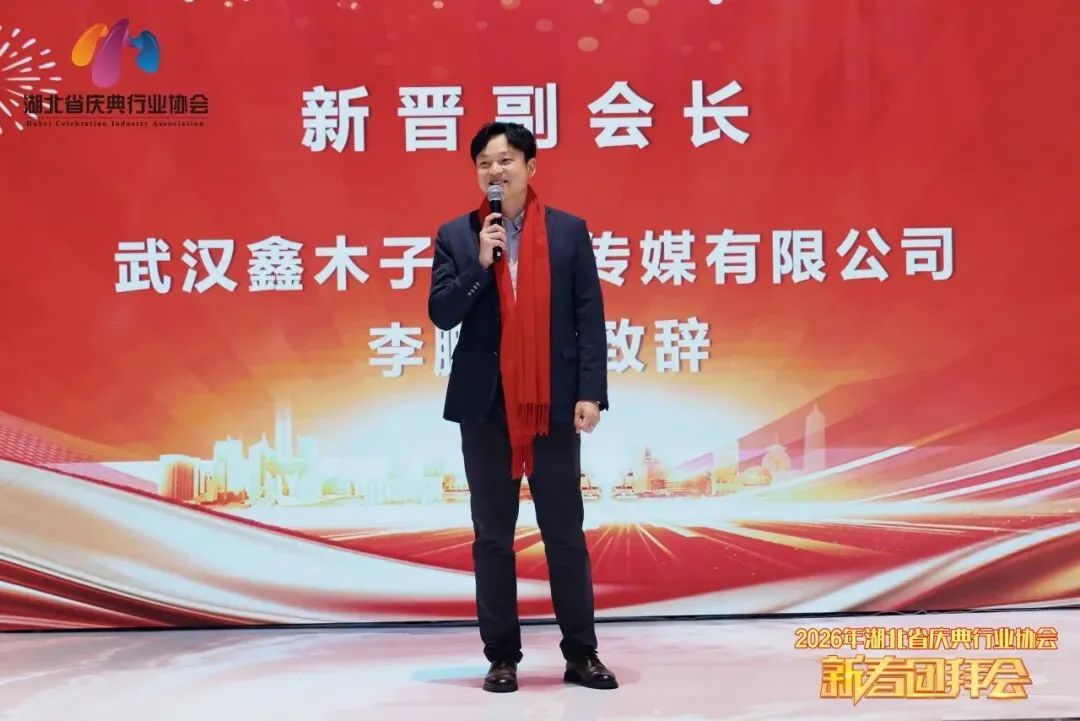 新晋副会长单位---武汉鑫木子文化传媒有限公司李鹏飞讲到,今天我们欢聚一堂共赴这场团圆盛会,能在此刻以协会新晋副会长的身份站在这里发言,我的内心满是荣幸与感恩,更深感责任在肩。首先,我要衷心感谢协会领导的信任与认可,感谢各位同仁、家人们的支持与厚爱,也感谢前辈们为协会打下的坚实基础,让我有机会为这份热爱的庆典事业、为我们这个温暖的大家庭贡献更多力量。未来,我将始终秉持“服务会员、助力行业、共谋发展”的宗旨,全力配合协会领导小组工作,积极推进协会各项事务。也希望新的一年里,我们同心同德、携手共进,让庆典事业在马年奔腾向前,再创佳绩!