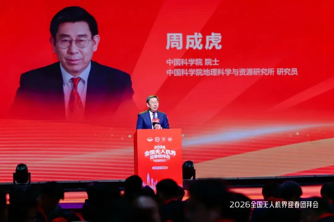 中国科学院院士周成虎致辞,法国欧洲科学、艺术与人文学院院士、世界无人机大会主席、深圳市无人机行业协会会长杨金才作协会工作报告。