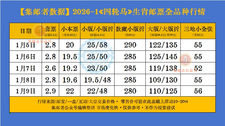 不知不觉《四轮马》生肖邮票已发行了5天时间了,随着网点零售量增加之下,今年四轮马的行情确实与往年不同。四轮马套票1月5日首日成交价在2.8元,目前成交价还是比较稳定!在2.9元左右。虽然主要套票线下零售量增加不少,虽然邮友们入手很容易,但对于市场行情影响并不是很大!而套票今年的走势稳中有升,与大小版持续下跌的走势完全不一样...今年其实四轮马生肖邮票品种中,《四轮马》小本票算是减量幅度最大的之一,较去年的《四轮蛇》小本票减少107万本,发行量减至280万本!发行量:280万套