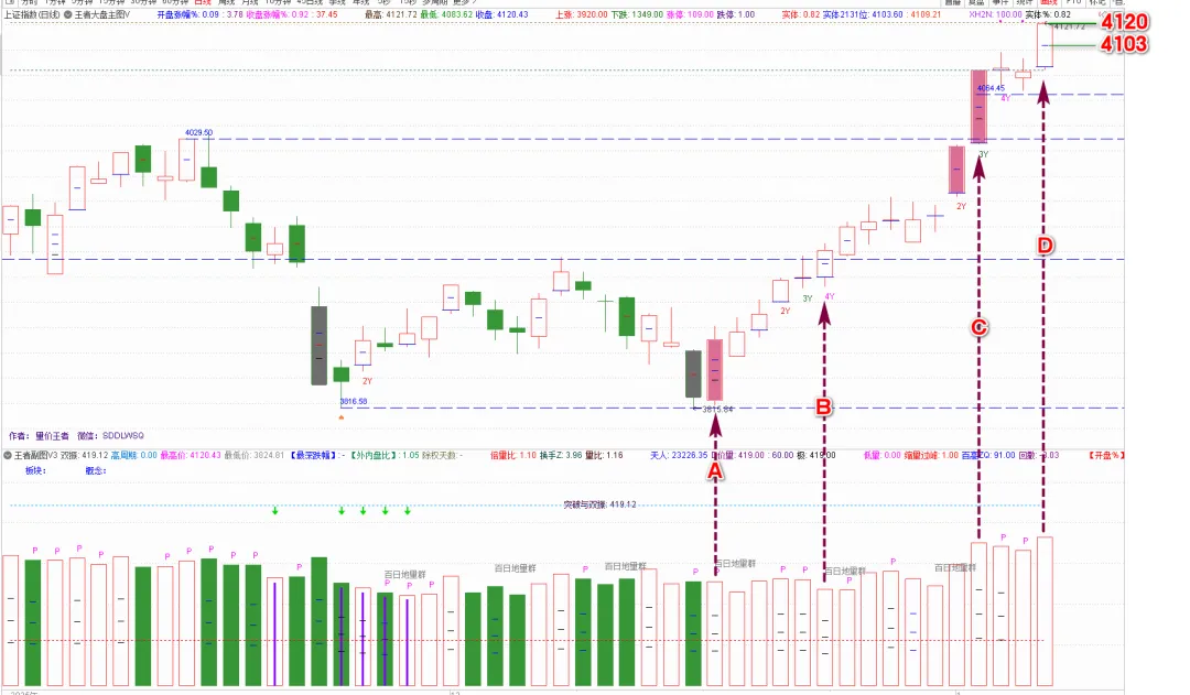 (4)C黄金柱确认后,对未来行情的态度,我们应该(选择其一):A积极看多作多;B谨慎看多;C看空。
