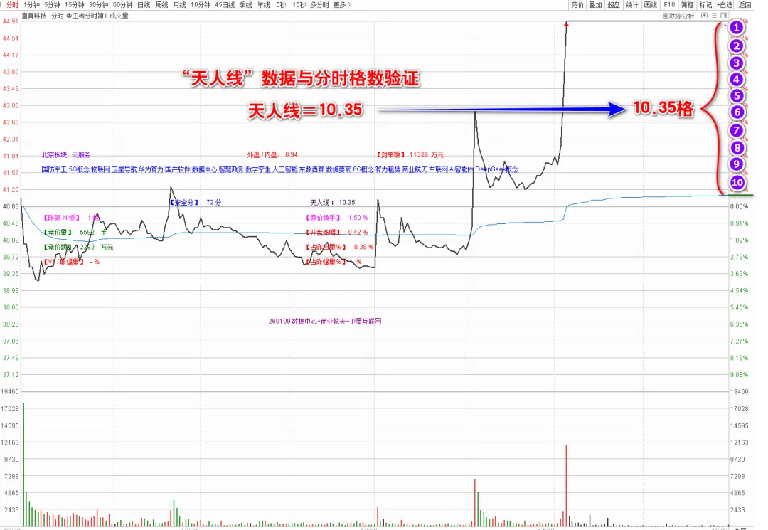 直真科技,天人线10.35。说明它在分时图上,天线与人线间隔了10.35格。