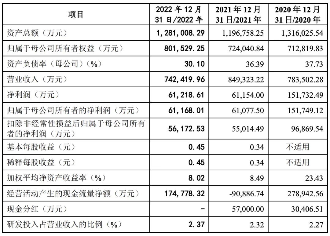 公司2020年、2021年、2022年营业收入分别为 783,502.28 万元、849,323.22 万元、742,419.96 万元,扣除非经常损益前后孰低的归属于母公司股东的净利润分别为 96,869.54 万元、55,014.49 万元、56,172.53 万元。
