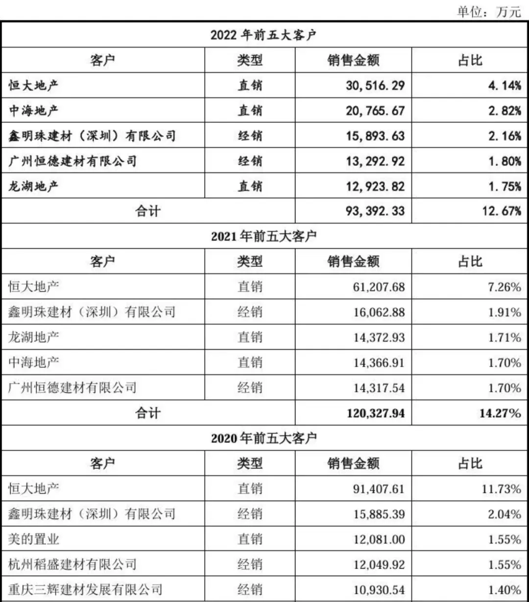 新明珠曾对恒大地产存在高度依赖,恒大既是其第一大客户,又是股东。报告期内,恒大销售额从2020年的9.14亿元锐减至2022年的3.05亿元,但应收账款余额却从2.14亿元激增至12.03亿元,占应收账款总额的43.93%。恒大地产的财务危机导致新明珠面临巨额坏账风险,侵蚀利润并占用大量资金,这一问题成为监管关注重点。