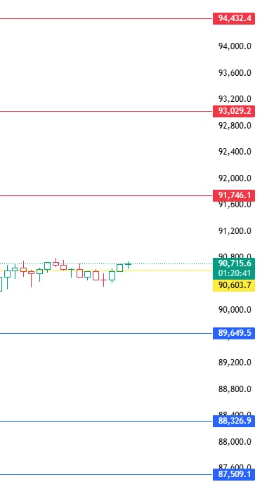 周末行情波动不大.只要日线级别不破关键位置89000.那多头趋势还在.小级别就会走震荡上行.今天小级别有机会插下来多单为主.仓位控制好每天围绕日内高空低多去做都是没有问题的.看今晚上走出波动出来.大饼今天留意90600这个位置.1-2小时级别只有站稳这个位置上方行情才开始反弹.留意上方这几个压力位置附近91750-93000-94430