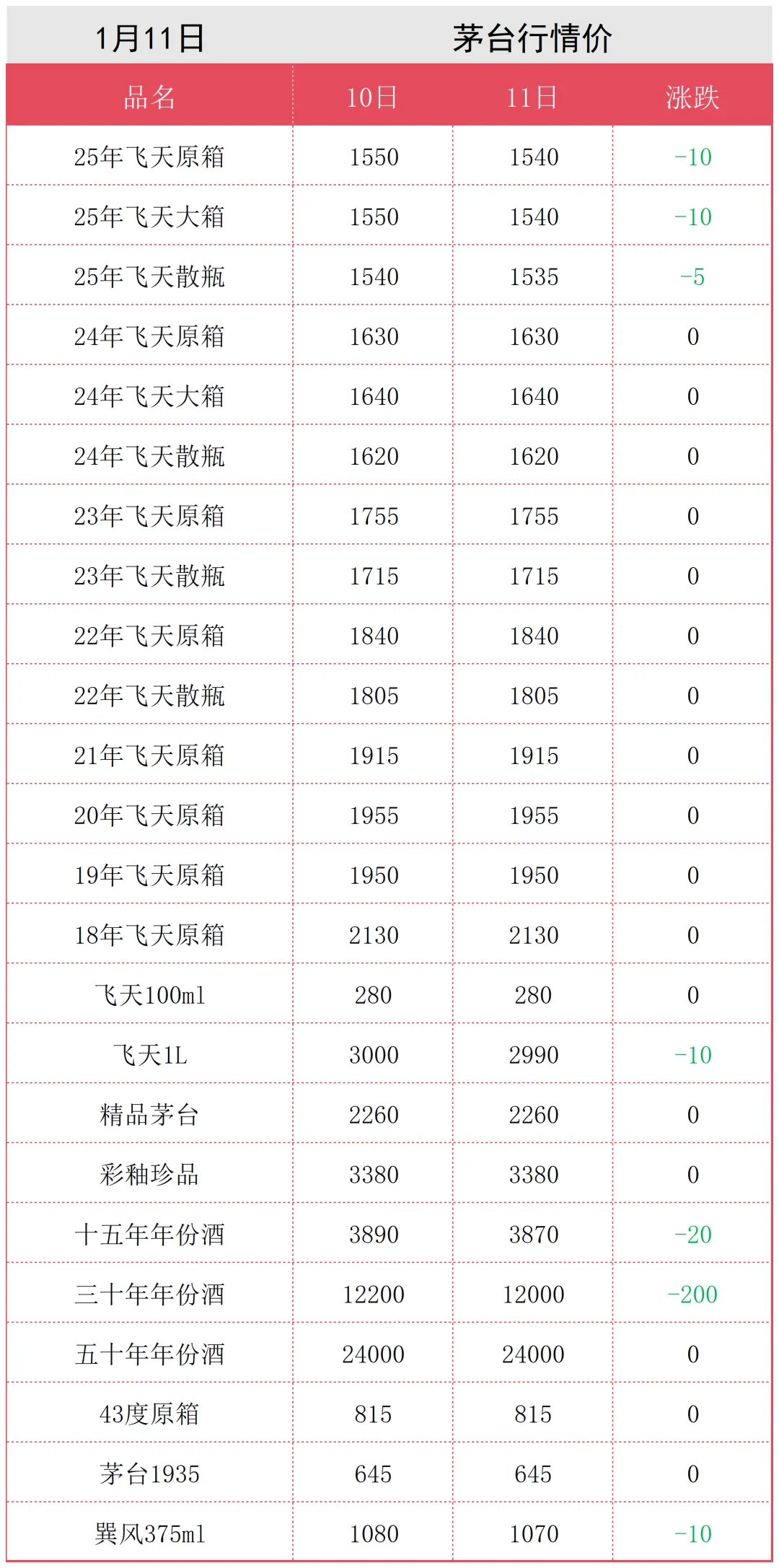 全线下跌!茅台酒1月11日行情价