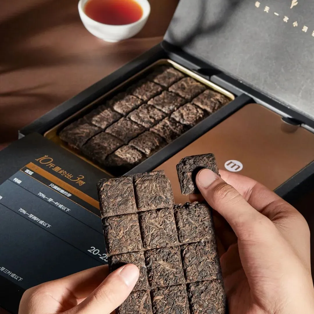 长方形茶饼被整整齐齐地半压成15片,每次轻轻一掰,就能轻松泡一杯好茶。