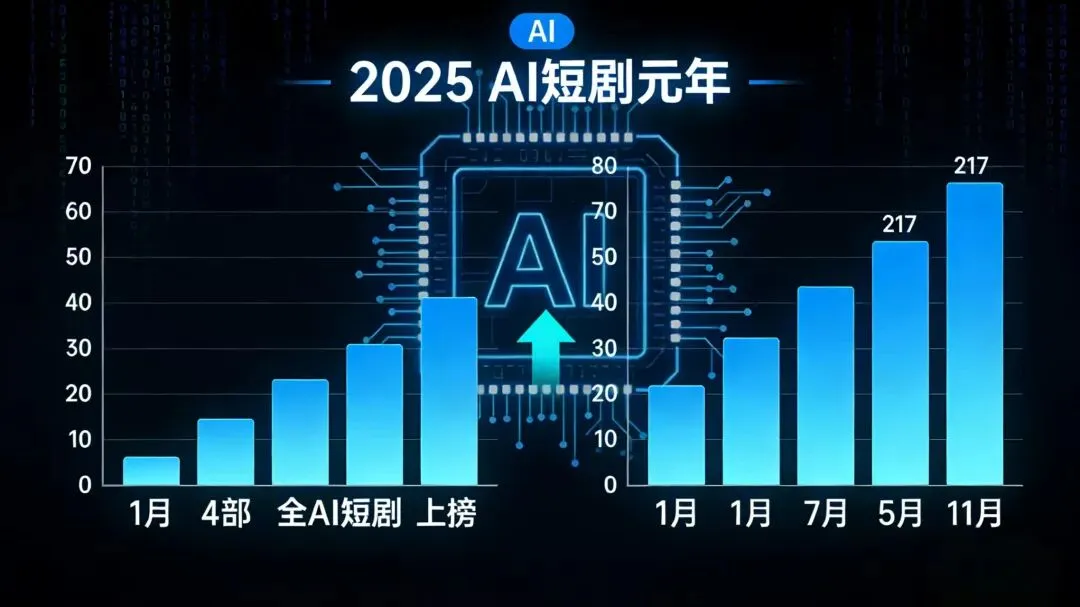 2025年,“AI”是短剧行业最火关键词,这一年也被称为“AI短剧元年”——从1月仅4部全AI短剧上榜,到11月增至217部,增速惊人。
