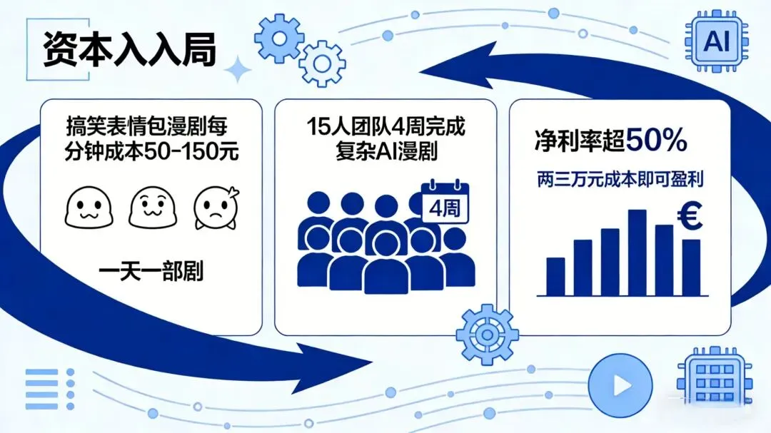 AI重构短剧生产逻辑:搞笑表情包漫剧每分钟成本50-150元,头部团队可实现“一天一部剧”;复杂AI漫剧15人团队4周即可完成。低成本催生高盈利,AI短剧净利率普遍超50%,两三万元成本即可盈利,吸引大量资本和中小企业入局。