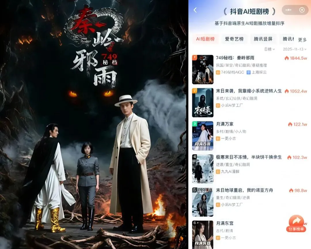 上市公司纷纷布局:新炬网络《749秘档:秦岭邪雨》上线19小时破千万播放量,带动股价波动;博纳影业推出“博卡一键AI短剧”工具并筹备AI原生动画电影。业内共识是,技术为辅助,优质剧本仍是核心竞争力。