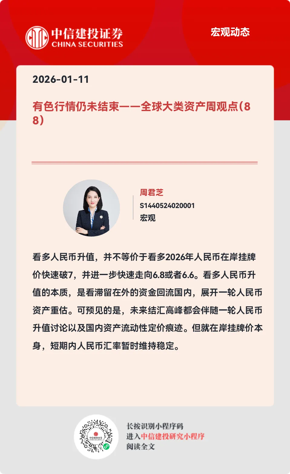 12月CPI、PPI环比均增长0.2%,表现好于预期,除国际定价的有色之外,耐用消费品、工业品中煤炭、锂电池、水泥、新能源车等内需定价品种价格也普遍改善,反内卷措施取得一定效果。开年以来,光伏、电池、外卖平台服务业继续推进反内卷举措,货币政策继续强调将光伏、电池、外卖平台服务业继续推进反内卷举措,走出通缩预计将是今年政策重要着力点和主线。