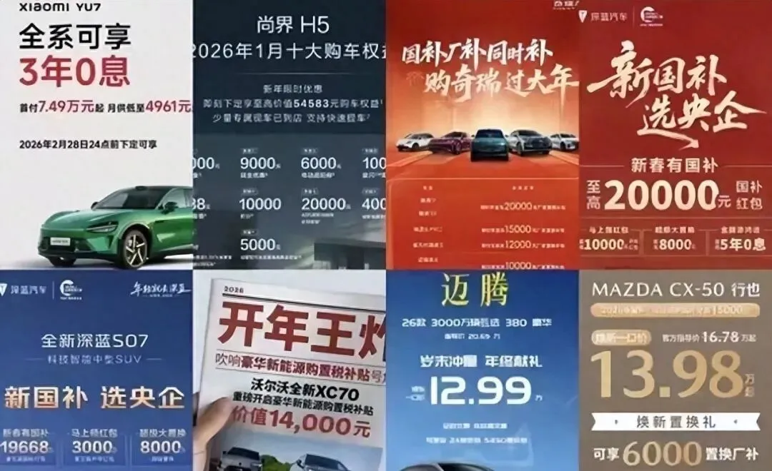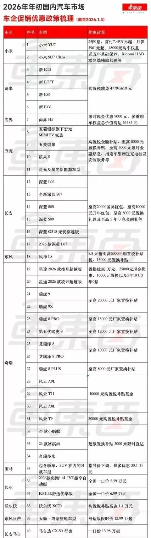 2026年刚开年,车市就像被点燃的鞭炮——热闹得停不下来。超过70款车型扎堆甩出优惠,14家汽车大厂直接下场“参战”,从宝马、一汽大众这样的主流品牌,到沃尔沃、起亚等合资车企,连东风日产、长安马自达也跟着加入战局。宝马带头掀起降价潮,31款车型官方指导价集体下调,最高能省30万出头;一汽大众一款中型车特供版更狠,直接一口价12.99万甩卖,要知道这车型原价可是20多万,相当于打了六折。经销商们忙得连喝水的时间都没有,官网优惠公告刷个不停,消费者看着这些数字,心里能不痒痒吗?
