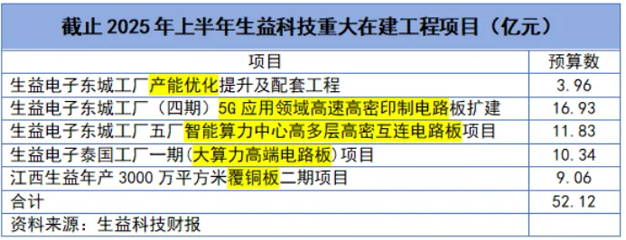 2025年上半年,生益科技共有5项重大在建工程,其中4项来自子公司生益电子产能优化与扩建,并集中在5G领域高速印制电路板与算力高多层板。
