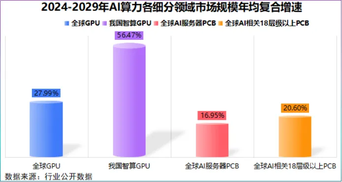 数据显示,预计2024-2029年全球AI相关18层及以上PCB板将以20.6%的年均复合增速增长。