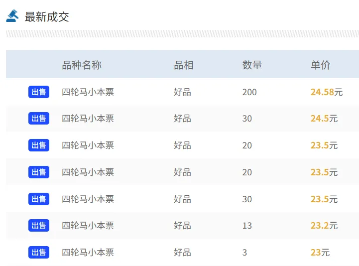 四轮马邮票已经发行了一周了,整体行情目前比较稳定,唯一持续上涨的只有四轮马小本票了!目前最新成交价已来到24元,溢价8元。较往年的生肖小本票行情走势来讲,还是不错的!发行量:2668万套