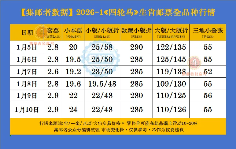 新邮《四轮马》生肖邮票行情:走势逐渐平稳,小本票涨至24元→