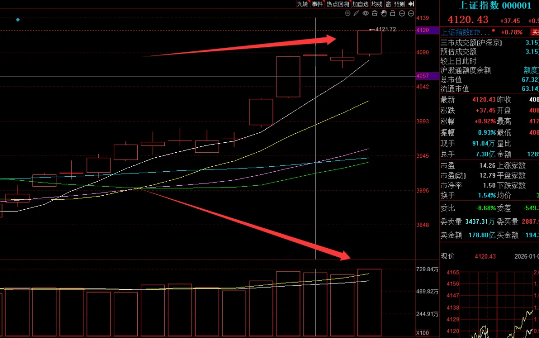 指数高举高打继续向上猛攻,在周五顺势加速成功站稳4100点,最关键的是量能放大至31000亿,相较周四再次增量3000多亿,这是市场能继续走强的关键,也是各个方向都有炒作接力机会的关键。