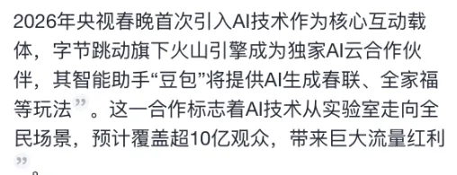 直白的说,因为春晚的流量洪峰是全球罕见的极端场景,只要这一次AI技术能够平稳的度过春晚,那么将直接证明我国自研的云基础设施以及迈向成熟,这标志着AI行业的从单纯的参数竞赛,正式迈入用户使用市场和场景渗透率的实用竞赛!