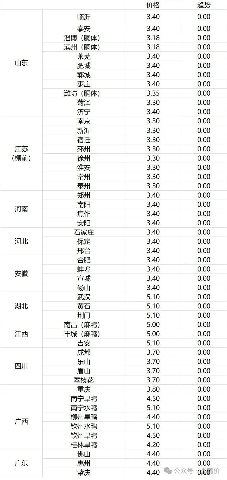 微评:鸭苗报价上涨。(注:南方只报当天价格)整体交投情绪平淡。根据产品、养殖成本及鸭苗现状分析,预计近期鸭苗价格呈稳中微调趋势。种蛋报价涨5分。温馨提示:该价格为主流厂家报价,实际销售价格以成交价格为准,价格仅供参考。