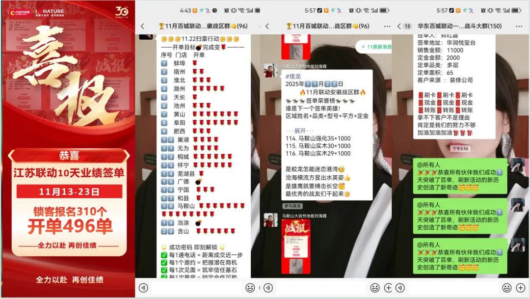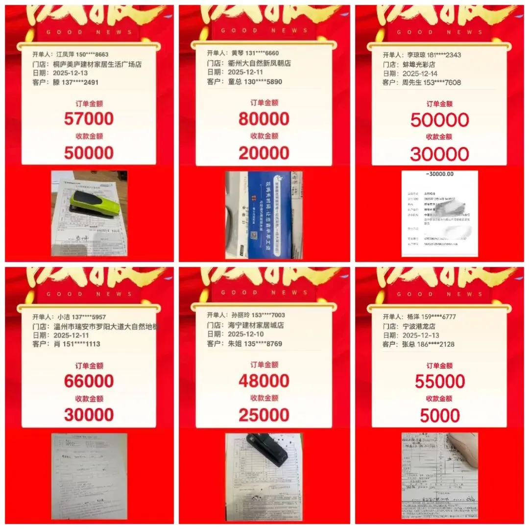 此次联动活动中,江苏区域仅10天便交出亮眼成绩单:累计收获310个顾客报名,成功开单496单,大单频出的战绩更是直观展现了市场对品牌的认可——从5万、8万到6.6万的订单金额,一笔笔实打实的成交,印证了大自然地板的产品力与渠道力。而一线团队手捧喜报的笑颜,也成为这场联动盛宴中最鲜活的注脚。