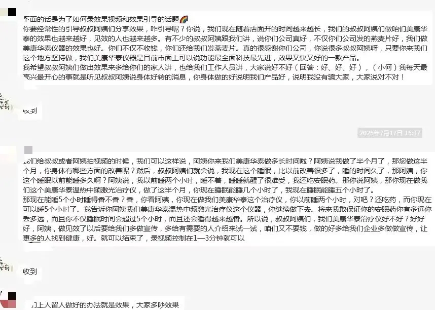 而且在这90天中,他们的讲师会不断地强化效果,让门店店长主动找老人要“效果视频”,要用统一话术等等。