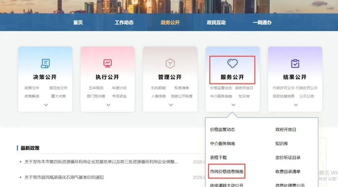 1、登录我委官方门户网站“上海市发展和改革委员会”(https://fgw.sh.gov.cn/),点击“政务公开-服务公开-市民价格信息指南”查看全文