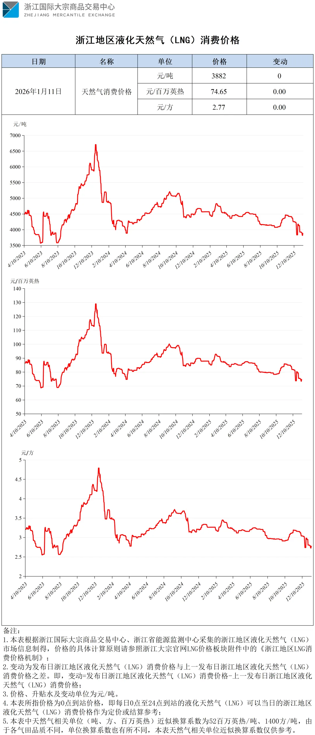 >【价格指数】浙江地区液化天然气(LNG)消费价格(20260110-20260111)