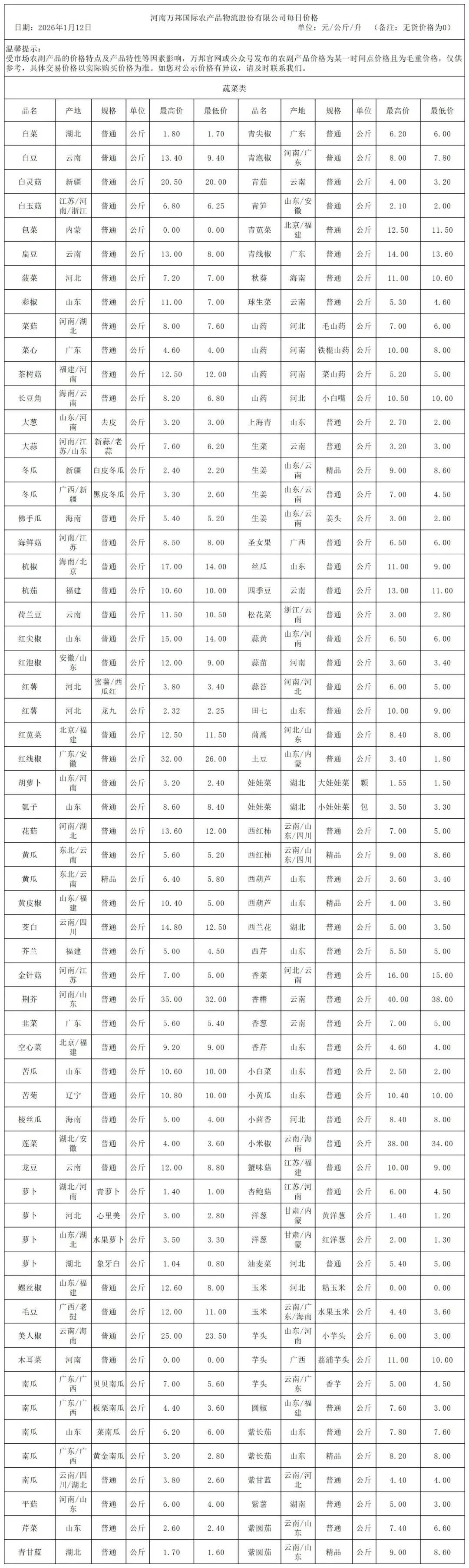 受市场农副产品的价格特点及产品特性等因素影响,万邦官网或公众号发布的农副产品价格为某一时间点价格且为毛重价格,仅供参考,具体交易价格以实际购买价格为准。如您对公示价格有异议,请及时联系我们(0371-56925555、18837153120)。