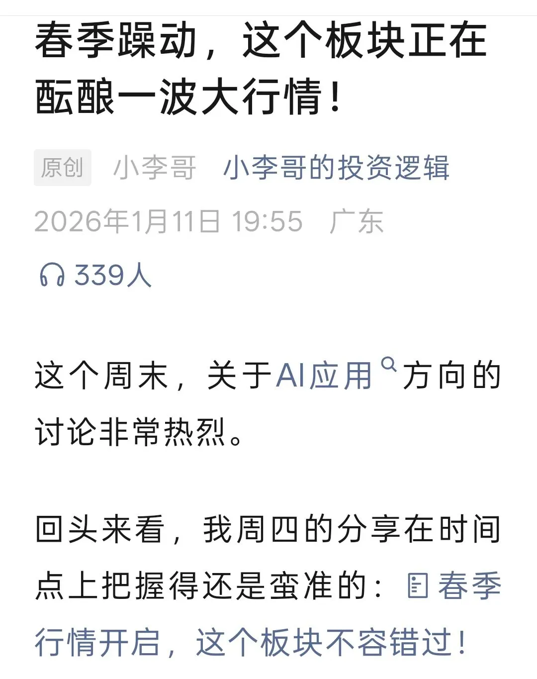 今天市场情绪确实起来了,板块有开启主升浪的样子。从整个科技投资的周期来看,前面几年算力这些“硬”环节涨得比较多,按照“硬三年、软三年”的规律,接下来资金的目光很可能会更多地转向“软”的应用层面。不少机构也认为,2026年很可能就是AI应用的投资元年。