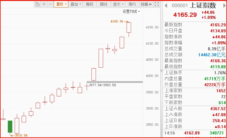 指数拿下17连阳,成交额也站稳3万亿,赚钱效应火热,大好行情,格局打开,不用畏手畏脚,好好珍惜。