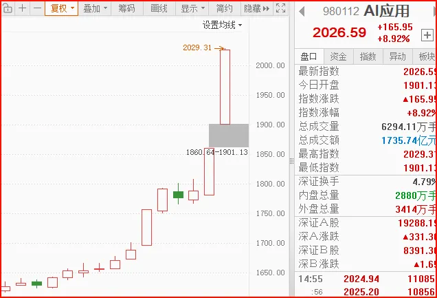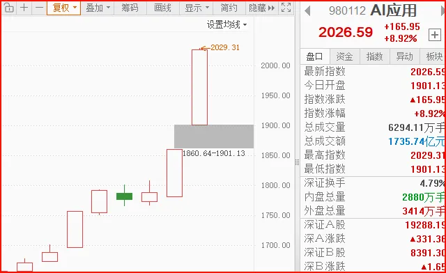 今天其实是属于受踏空资金推动的超跌反弹,目前来看,还是需要一根中大阳线来确认变盘拐点、激活板块做多情绪。从当前结构来看,短线机会不多,更适合在仓位保持不变的情况下,等待调整到箱体底部、或者板块阴线时考虑低吸做T。总体中线逻辑仍在,故事没有讲完,指数第三波主升浪下,光伏这样的低位板块仍有估值空间。2.AI应用板块今天再度强势爆发,毫无疑问已站上C位,成为当前具有号召力的绝对主线之一。周末传出重磅消息——DeepSeek计划于春节前后推出V4模型,借着这一利好东风,AI应用方向今天高开高走、气势如虹,场内情绪高度亢奋。传媒、游戏、医疗等AI+细分概念健康轮动,板块内部资金承接良好,结构稳固。从节奏上看,当前位置追高性价比不高,可以考虑等待板块分歧回调阶段择机低吸参与。AI应用仍是今年科技板块的重点方向之一,无论从资金关注度、催化密集度,仍值得重点留意。风险提示:【以上涉及个股仅为公开资讯整理,不构成任何具体投资建议】三、乾坤推演