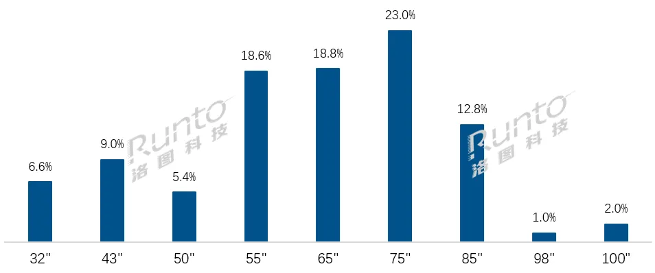特点一:全面进入大屏时代,75英寸蝉联第一尺寸,TOP4尺寸皆为55+寸
