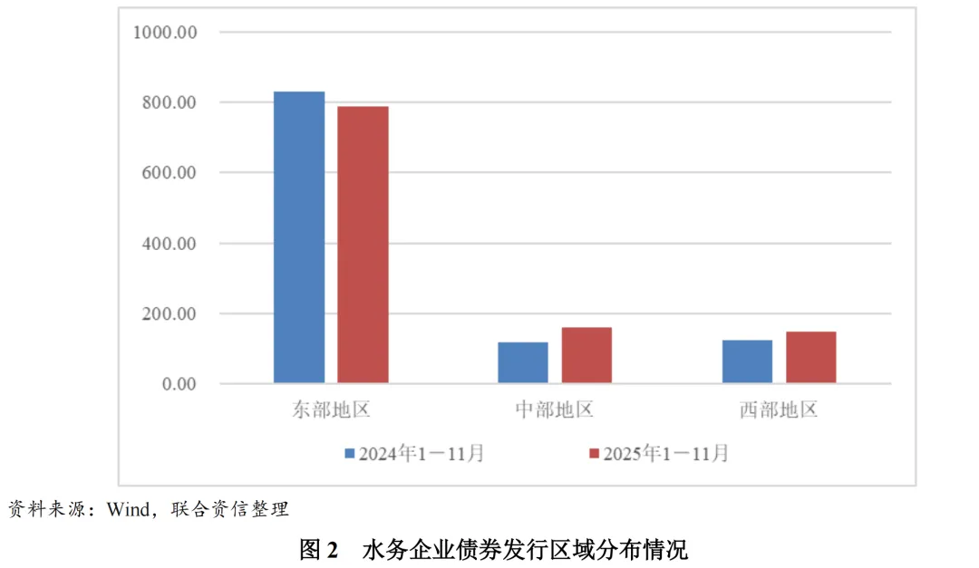 从区域分布来看,水务行业债券发行呈现明显的区域集聚性,东部地区发行规模最大,达到787.29亿元,占71.80%;中部地区和西部地区发行规模远低于东部地区,分别为160.70亿元和148.50亿元,分别占14.66%和13.54%。这种区域不平衡既反映了各地区水务基础设施建设需求的差异,也体现了区域经济发展水平和财政实力的差距。与2024年1-11月债券发行规模相比,东部地区、中部地区和西部地区同比分别下降5.01%、增长36.53%和增长18.80%。或由于国家政策向中西部地区倾斜、地方融资模式积极创新和宏观债市环境友好等因素共同作用,中西部地区水务企业债券发行规模增速明显高于东部地区。