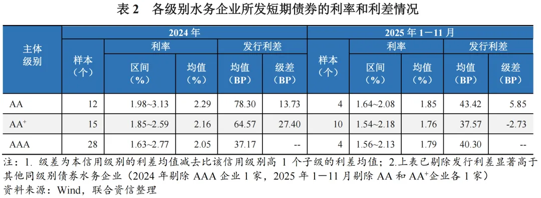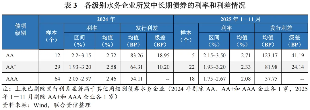 从发行利率和利差来看,在利率下行周期下,各级别水务企业短期债券和中长期债券平均发行利率均较2024年全年进一步下降。除AA和AA+水务企业短期债券发行利差较2024年全年有所下降外,其余级别和期限的水务企业债券发行利差均较2024年全年呈现不同程度的增长。