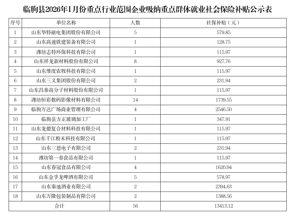 附:临朐县2026年1月份重点行业范围企业吸纳重点群体就业社会保险补贴公示表