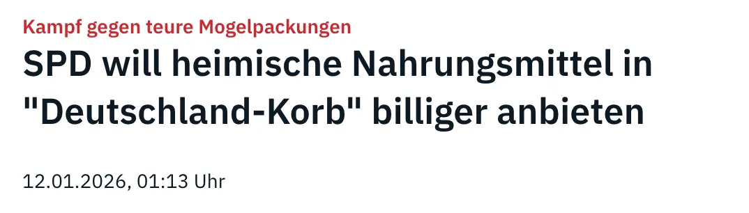 根据社民党的一份构想文件,德国主要零售连锁企业可在自愿基础上推出一个所谓的“德国食品篮”。这一做法借鉴了希腊的经验,核心思路是由超市提供一个价格相对低廉、且保持稳定的商品组合,所涵盖的应是“在德国生产、来自所有重要商品类别的基础食品”。该文件内容由《莱茵邮报》披露。
