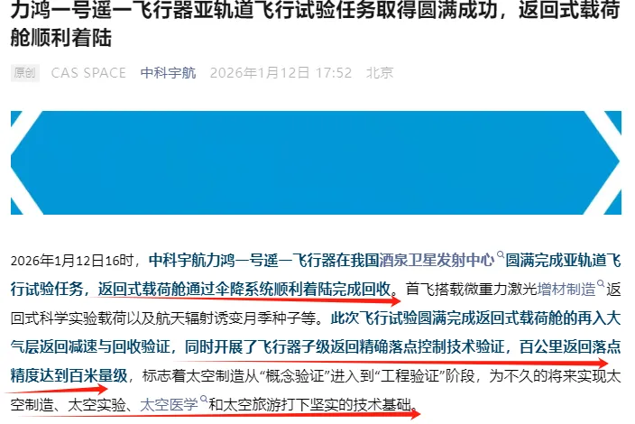 盘后消息,中科宇航力鸿一号完成亚轨道飞行试验,返回式载荷舱通过伞降系统顺利着陆完成回收。力鸿一号飞行高度约120千米,主要面向低成本亚轨道科学实验(太空育种、生物医药、空间微重力试验等),未来可提供亚轨道太空旅游服务。