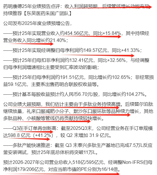 药明康德:2025年收入454.6亿元,同比+15.8%。经调整归母净利润149.6亿元,同比+41.3%。25年三季报公司指引25年全年收入435-440亿元,业绩超预期。