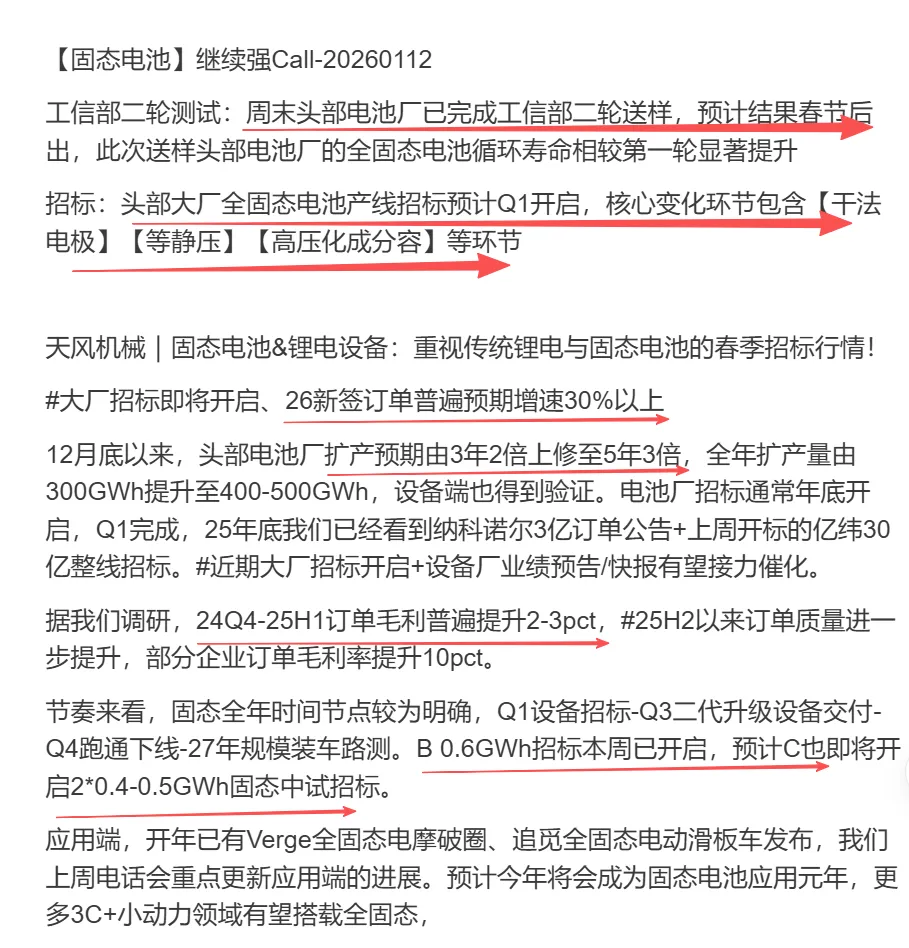 头部大厂全固态电池产线招标预计Q1开启,扩产预期由3年2倍上修至5年3倍,全年扩产量由300GWh提升至400-500GWh