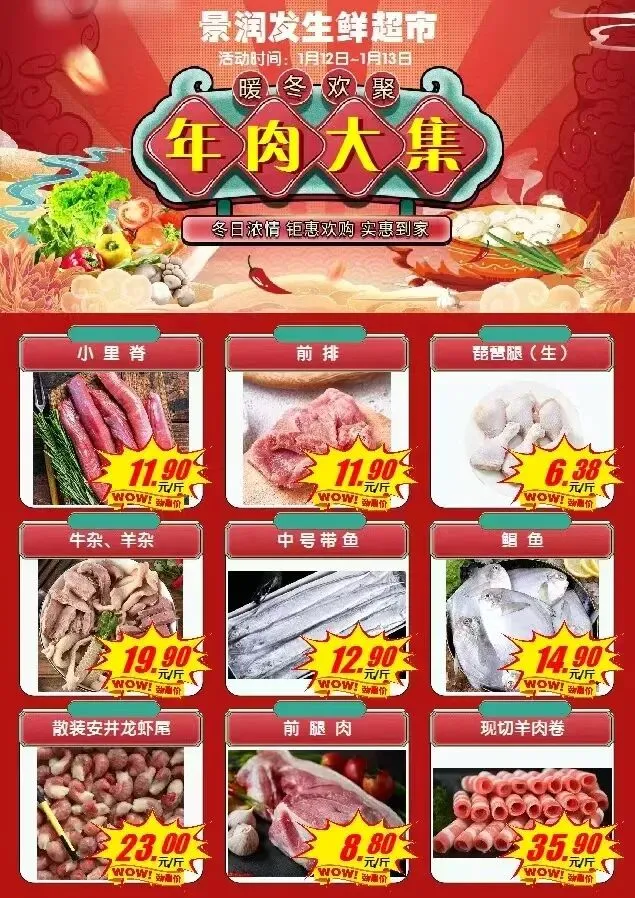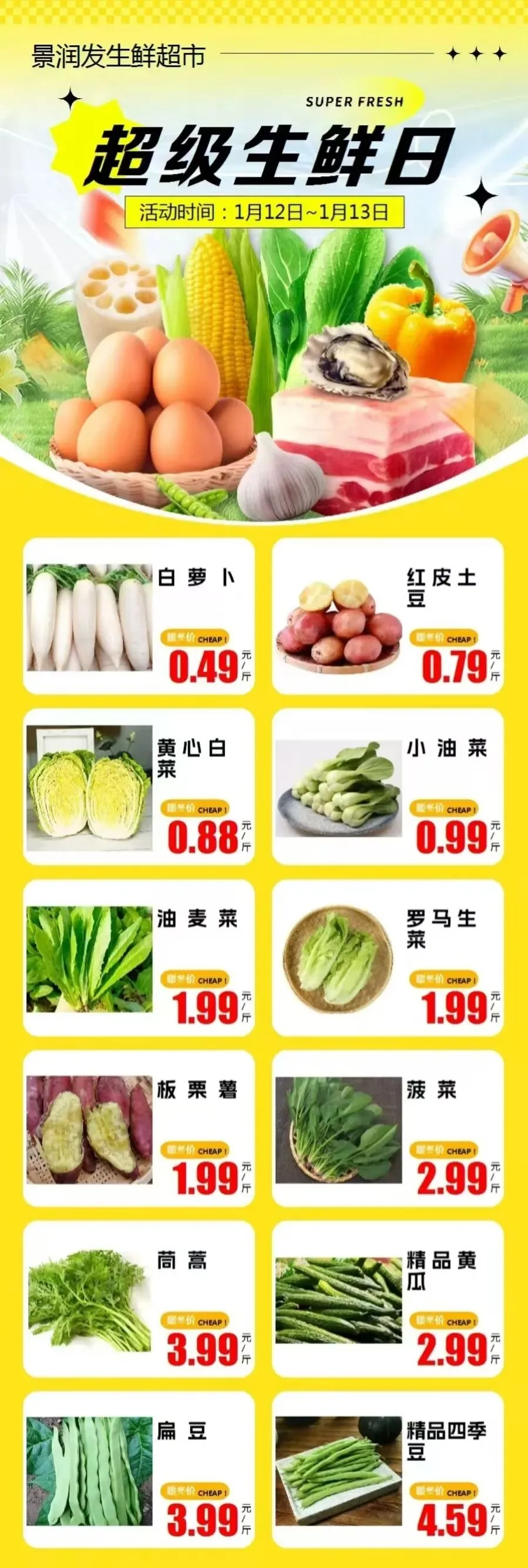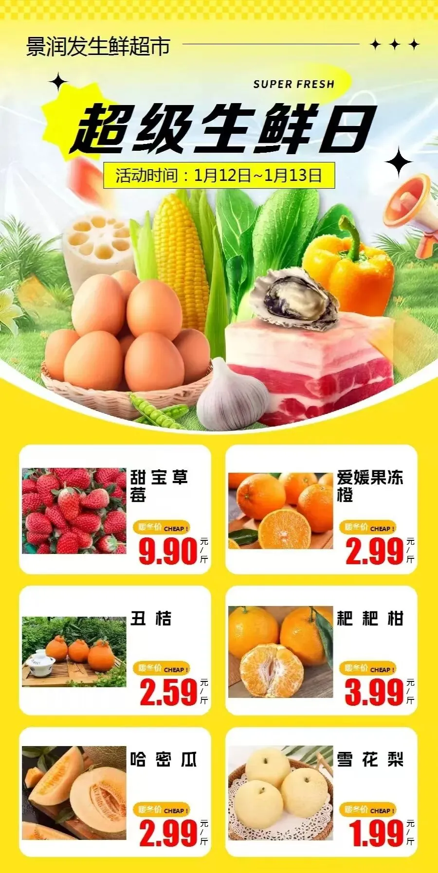 爆款单品:板栗南瓜1.99元,油麦菜1.99元,罗马生菜1.99元,扁豆3.99元,姜4.59元,西葫芦1.99元,板栗薯1.99元,黄心白菜0.88元,红皮土豆0.79元,白萝卜0.49元,莴笋1.58元,菜花1.99元,菠菜2.99元,小油菜0.99元,甜宝草莓9.9元,精品沙糖桔2.99元,爱媛果冻橙2.99元,丑橘2.59元,大棒骨7.5元,羊杂牛杂19.9元,前排11.9元...