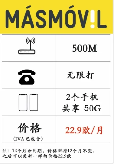 西班牙网络公司很多互相更换现在都不需要换路由器了,给大家更换网络公司带来了极大的便利,比如Movistar ↔ O2不需要换路由器,连手机卡都不需要更换,又比如 Masmovil-Yoigo-Orange-Jazztel-Alemobil-Oroc 等公司互相更换也是不需要更换路由器. 同时各公司也推出的特价套餐,比如Masmovil 公司。推出特价套餐,500兆网络+2个手机一起使用50gb,总共价格仅19.9€/月!第2个地址500兆网络仅14.9€/月,价格已包IVA