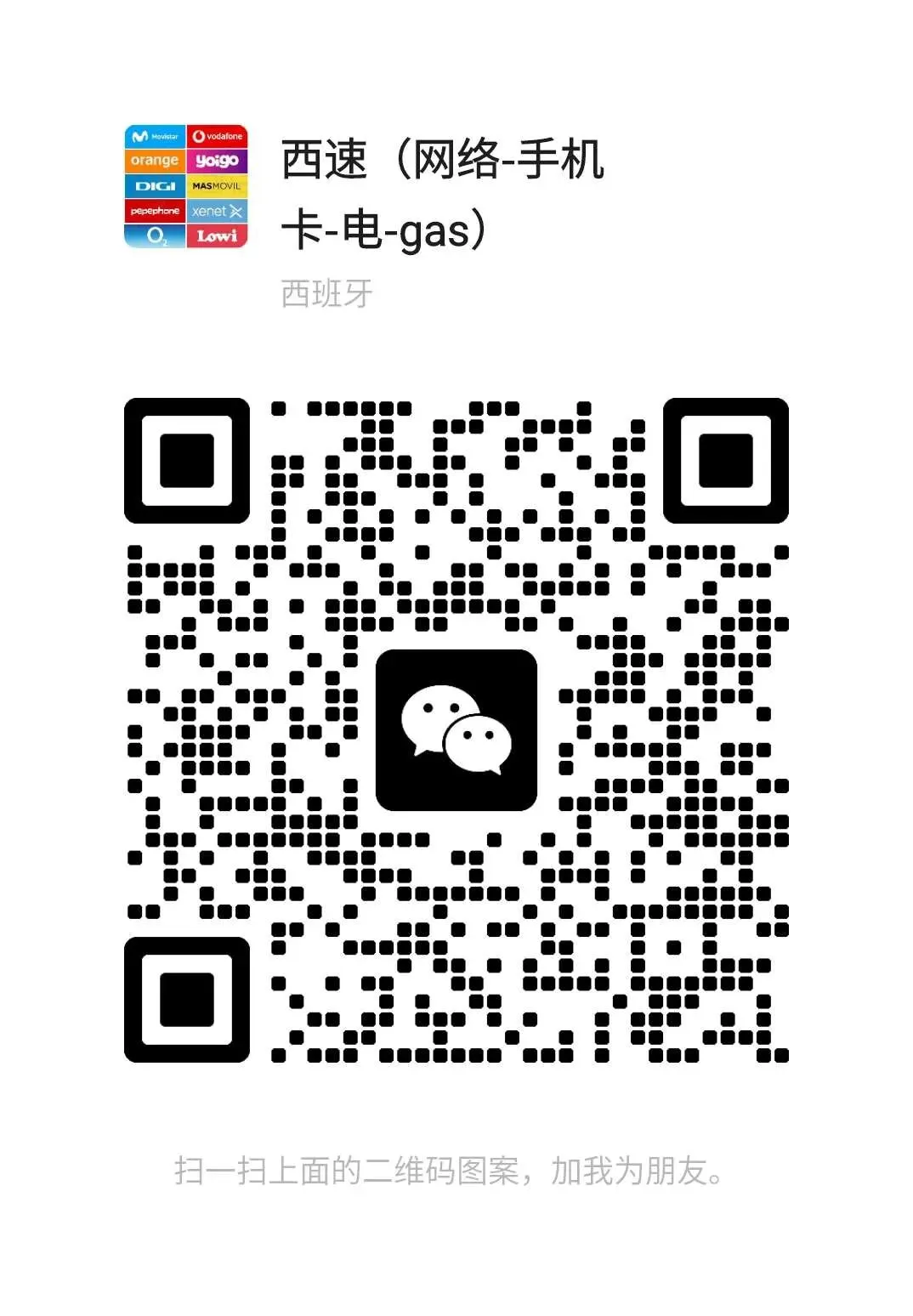 另外我们还代理了多家电力公司,可以帮客户进行电力公司的比价,寻找最便宜的公司,比如Naturgy公司针对2.0套餐以上的客户推出了特价套餐仅0.119€/度电,(针对功率小于15kw)且是全时间段,固定的价格,并且没有合同期,针对住家,店面均可办理,功率大于15kw价格0.097欧/度起优惠价可加微信另询。优惠电价推出后就引起了广大华人同胞的关注,针对很多华人同胞问心的问题,例如如何办理,如何签合同,是否有合同期,以及合同期内是否会涨价等一系列问题,Naturgy公司为大家提供了华人代理商中文代理服务渠道,为大家排忧解难。大家可以扫码联系并咨询。西速公司简介(XISU2020 S.L CIF:B10738573)主营业务:网络安装,手机套餐,警报器及电和GAS比价更换等业务,我们在市场上已深耕多年,累积了丰富的经验,熟悉各网络和电力公司的套路避免客户踩坑,关于电力公司我们代理多家市场上主流的电力公司,会为客户每年比较和选择最便宜的公司。关于网络为我们的客户提供BAJA旧网络,发票问题的处理等增值服务。联系电话610359088