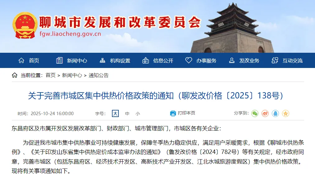 而在 2025 年 11 月 1 日起,聊城市城区集中供热价格政策迎来调整。