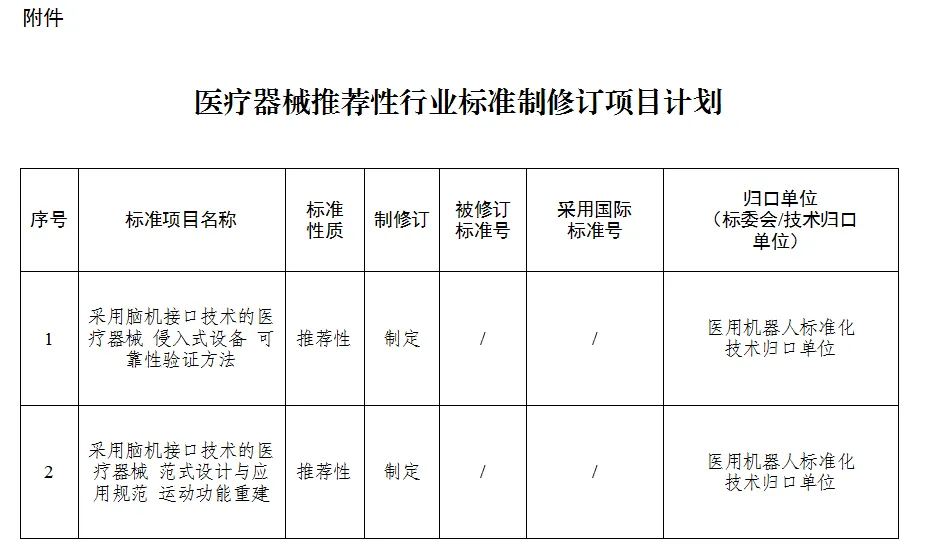 根据《医疗器械标准管理办法》《医疗器械标准制修订工作管理规范》要求,国家药监局经公开征求意见和组织专家论证,确定了《采用脑机接口技术的医疗器械 侵入式设备 可靠性验证方法》等2项推荐性医疗器械行业标准制订计划,现予以公示。公示期间,如有异议,请向国家药监局反馈。