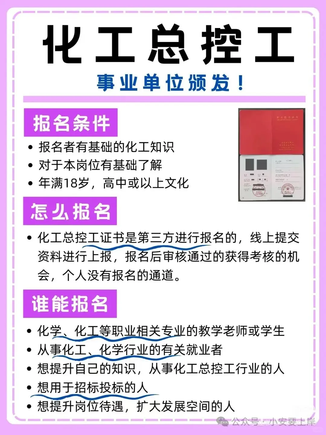 在化工行业深耕,想提升竞争力、拓宽就业路?那这本「化工总控工证」可别错过!作为行业核心技术证书,它不仅是岗位准入的“敲门砖”,更是升职加薪的“加分项”。今天就为大家拆解报考全流程,疑问一次性解答~
