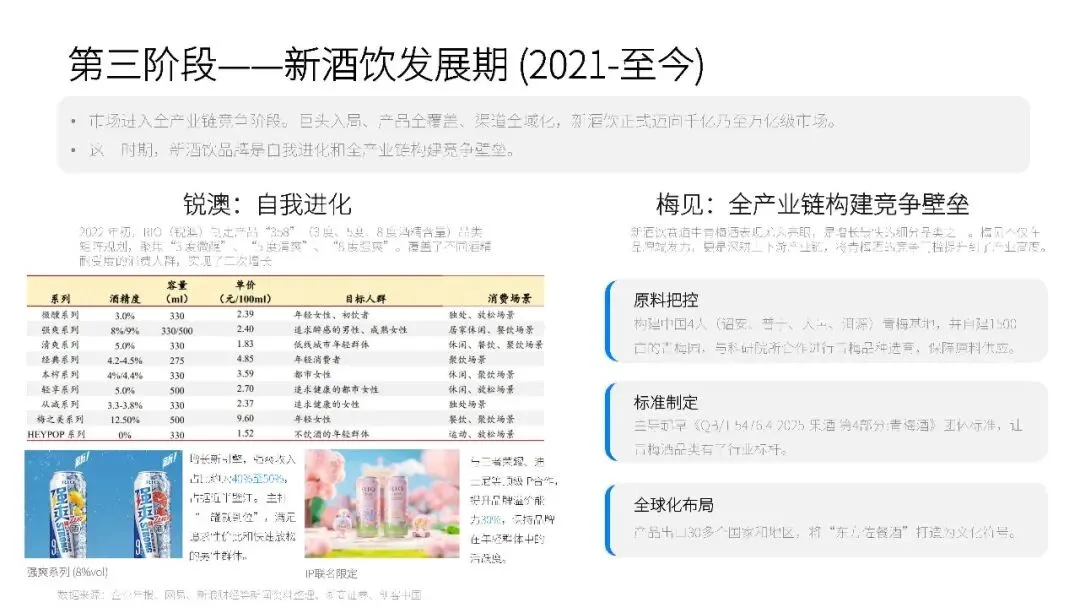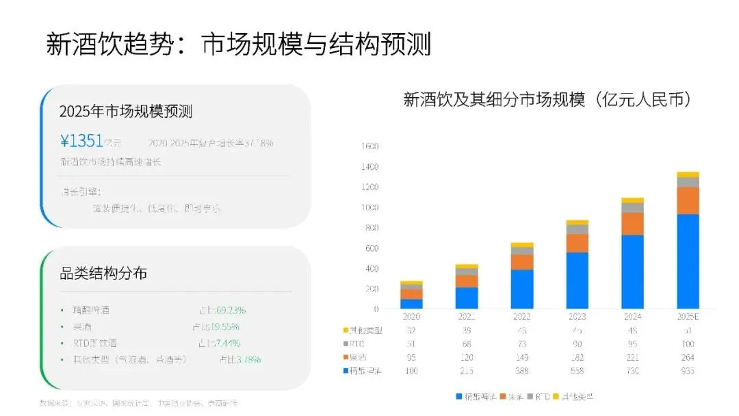 新酒饮的产品结构呈现出明显的低度化和多元化趋势。与传统酒类相比,新酒饮的度数普遍较低,更注重口感和风味的创新。从果酒、梅酒到预调酒、苏打酒,再到精酿啤酒和低度白酒,新酒饮的品类丰富多样,满足了不同消费者的需求。