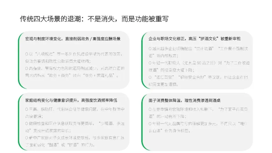 过去,酒在社交场合中往往是一种“必须喝”的存在,无论是商务宴请、婚宴还是节日礼赠,酒都扮演着重要的角色。但随着代际更替和消费观念的转变,这种“必须喝”的场景正在减少。年轻一代更加注重个人边界感,“不喝”逐渐成为一种可被接受的选择。“想喝一点”的场景却在不断增加,从日常的独酌放松,到朋友聚会时的小酌,再到户外露营、音乐节等新兴场景,酒的需求变得更加多样化和个性化。