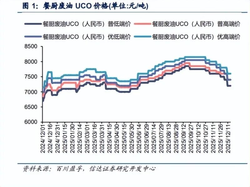 可持续航空燃料(SAF)的价格变化还受到原料供应与技术发展的综合影响。中国取消 UCO 出口退税促使更多原料留在国内,加剧了全球原料市场的紧张格局,全球原料供应瓶 颈显著,中国 UCO 实际收集量约 540 万吨,其中约 55%用于出口,45%用于国内生物柴 油生产,难以同时满足出口与国内生物柴油及新兴 SAF 产业的需求,导致 UCO 价格持续 上行,直接传导至 SAF 生产成本。未来,在各国强制添加目标未改、原料供应持续偏紧的 背景下,我们预计 SAF 价格或将维持高位运行。