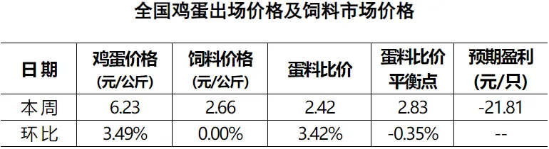 本周全国蛋料比价为2.42,环比上涨3.42%。按目前价格及成本推算,未来蛋鸡养殖每只亏损21.81元。